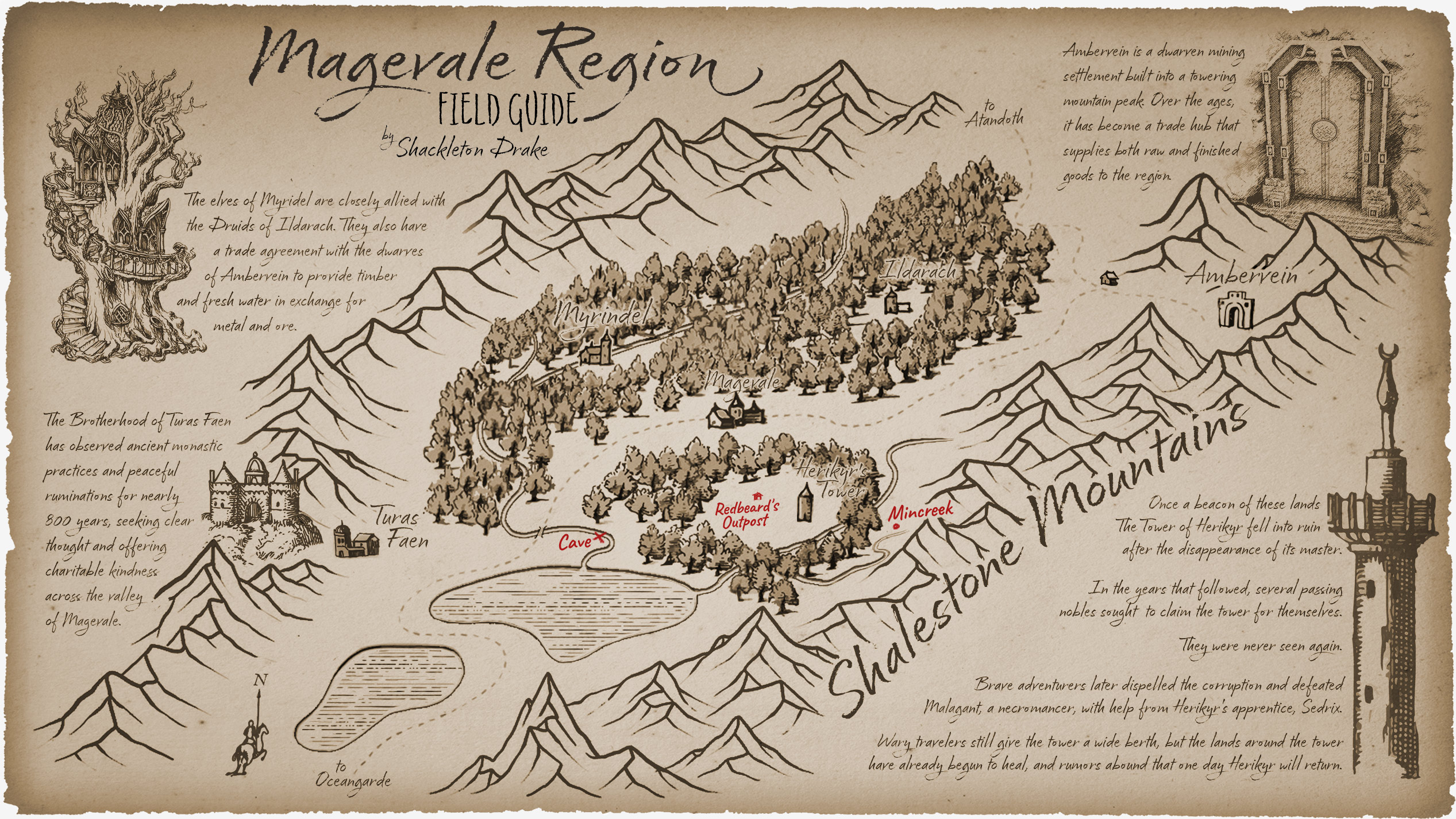 Throughout his travels, famed explorer Shackleton Drake produced numerous field guides for travelers, traders, and adventurers. This one shows the area around the town and valley of Magevale. Additional locations the party has discovered are shown in red.