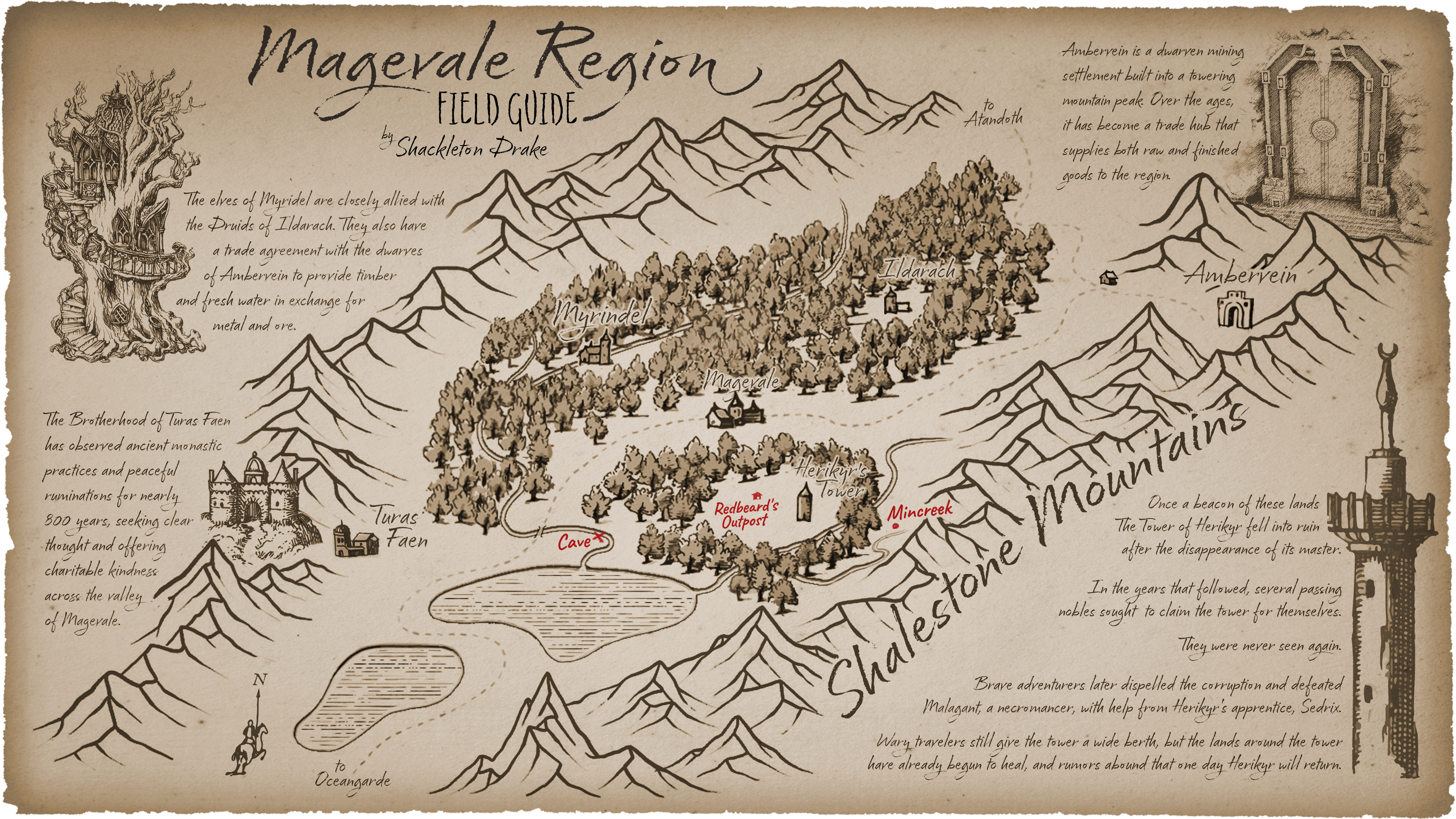 The valley here was once under the purview of a powerful mage named Herikyr. She had wandered and adventured through and around these mountain ranges, battling dark and powerful creatures and seeking ancient knowledge among the caves and mountaintops. She befriended both the elves of Myrindel and the dwarves of Ambervein and slowly built a base of operations southeast of what is now the town of Magevale.